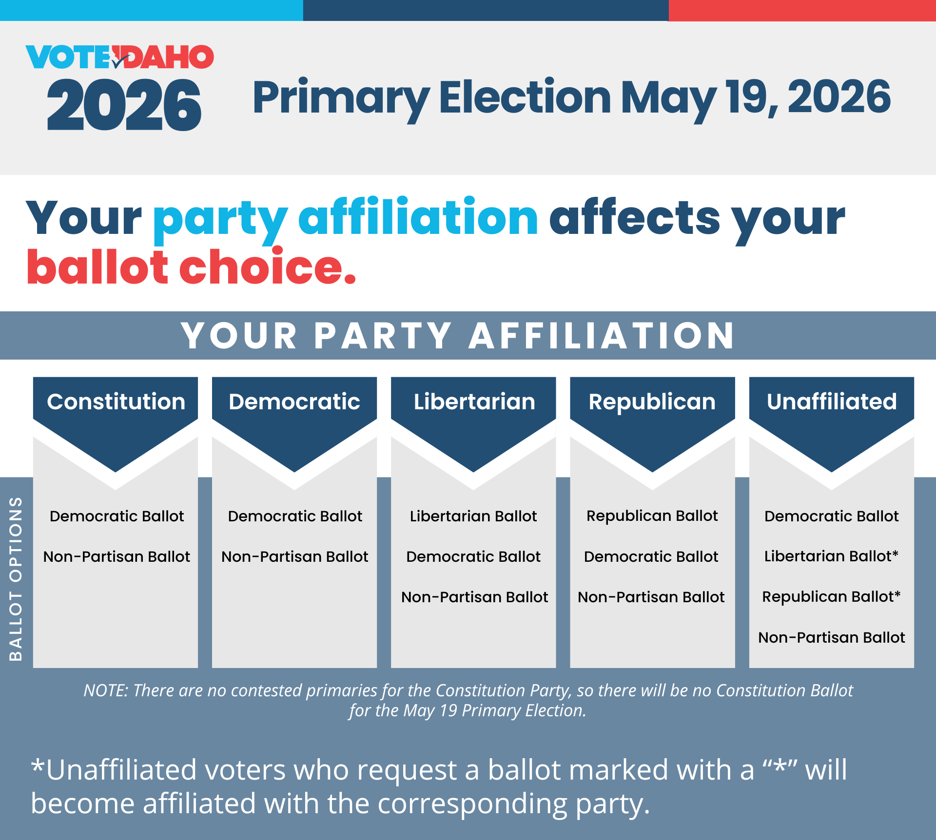 Check your party affiliation by going to voteidaho.gov or calling our office!