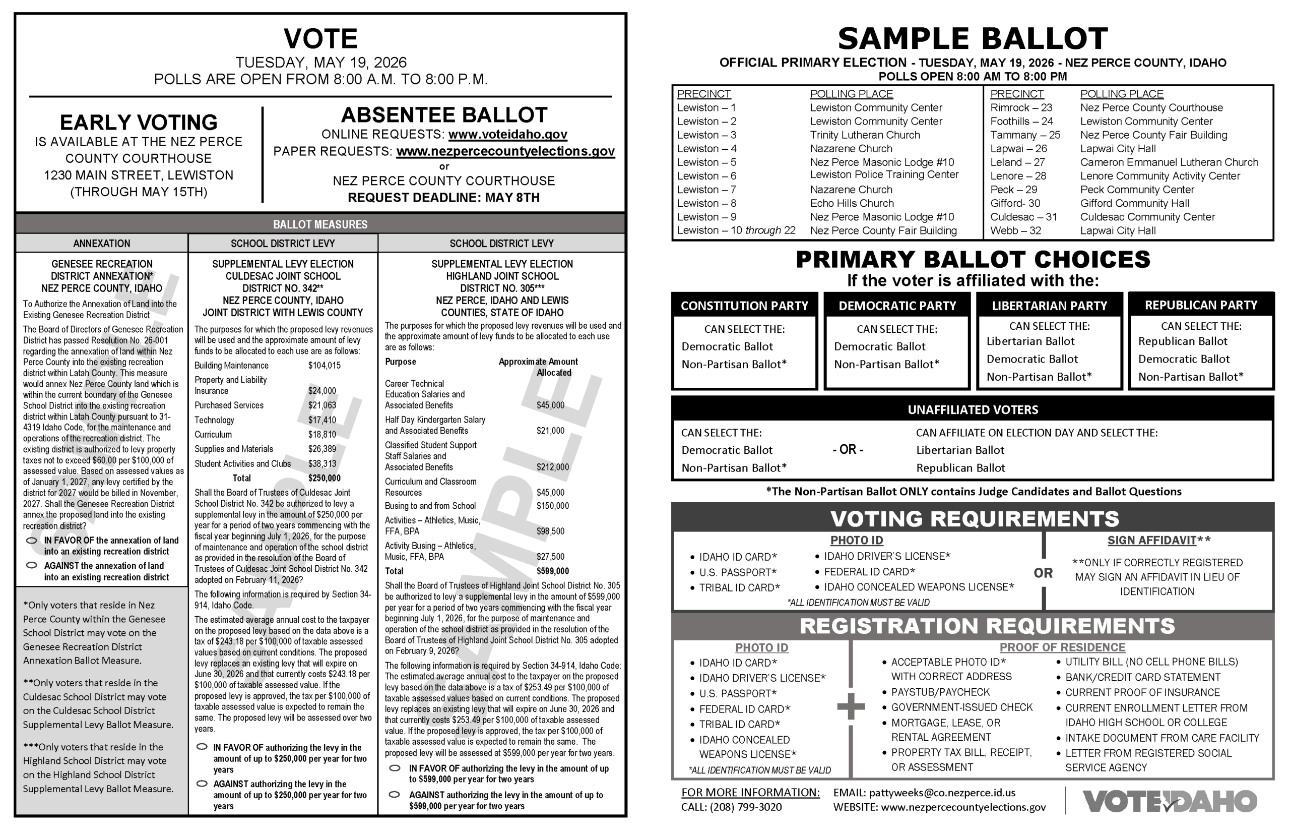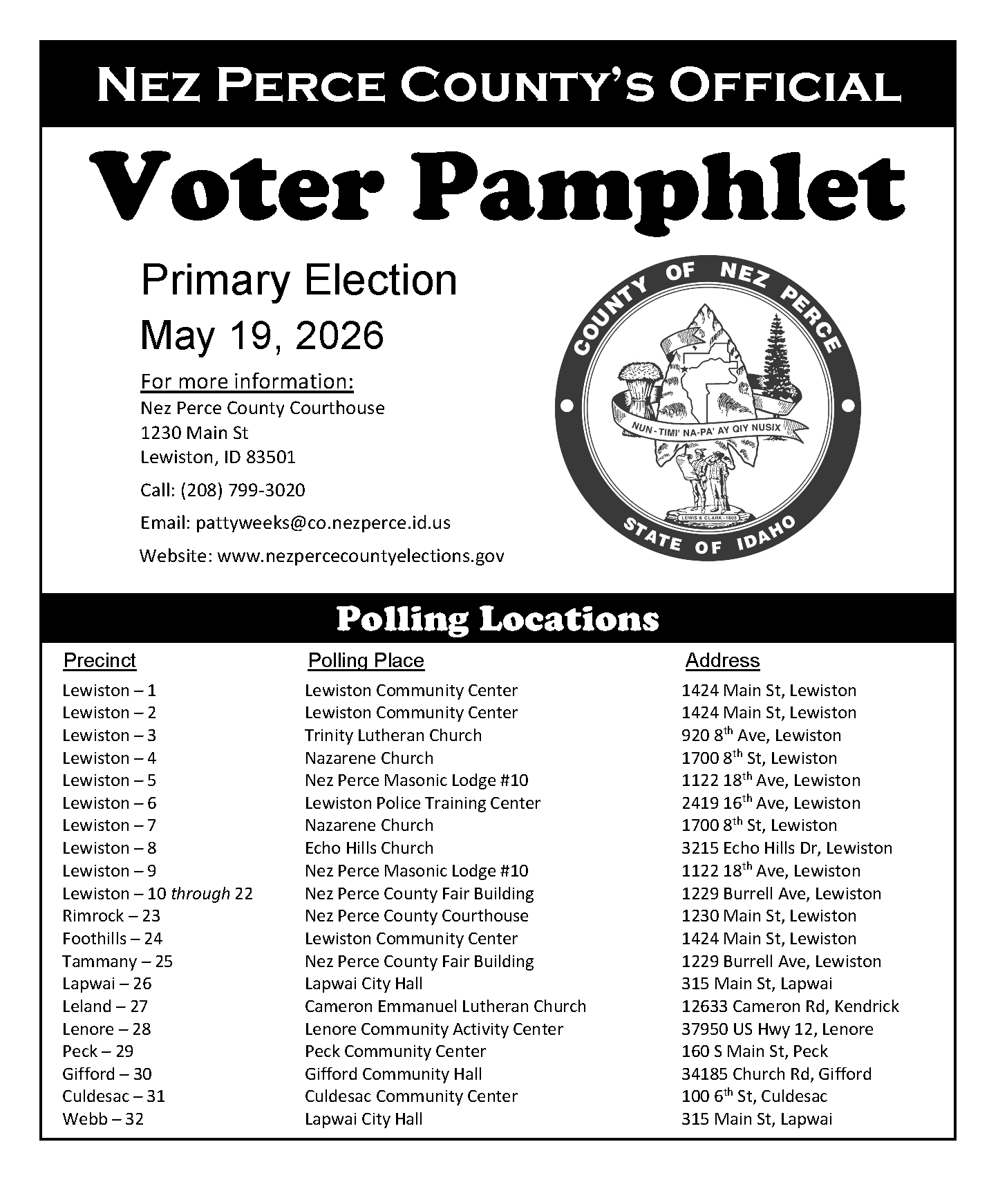 To search for your polling place based on your residence address click the link below or call the Nez Perce County Elections Department at 208-799-3020.